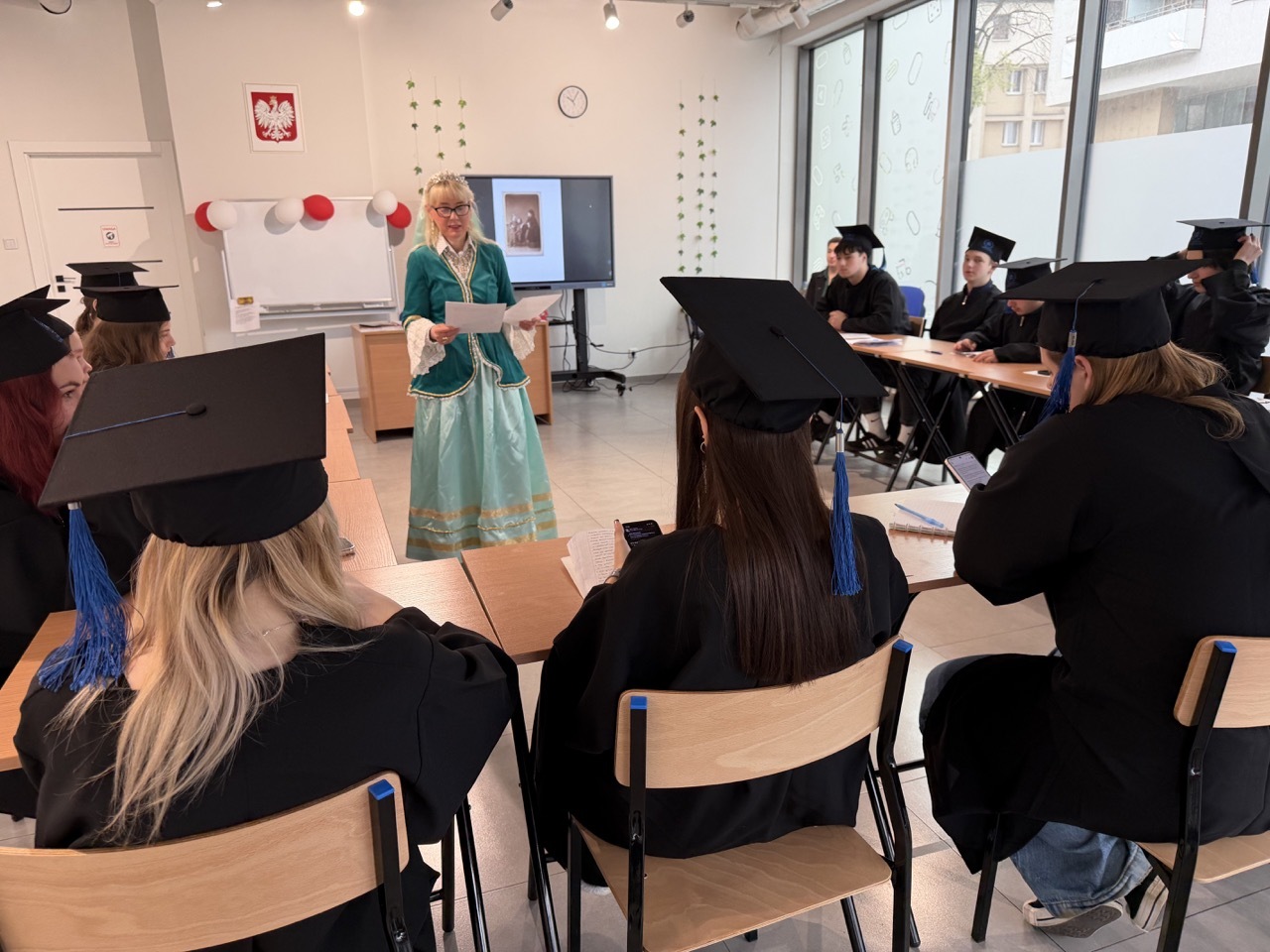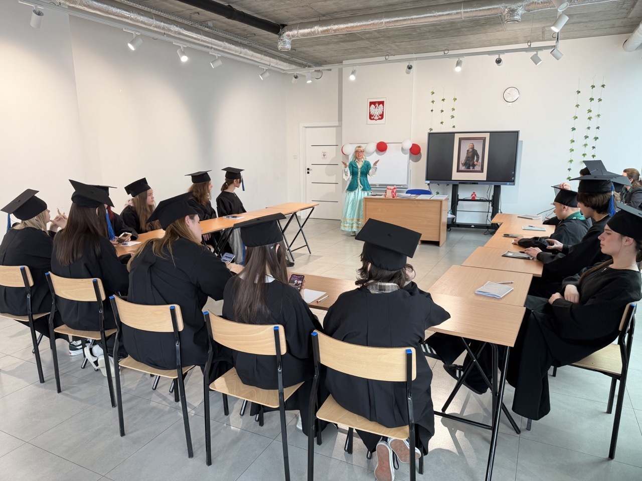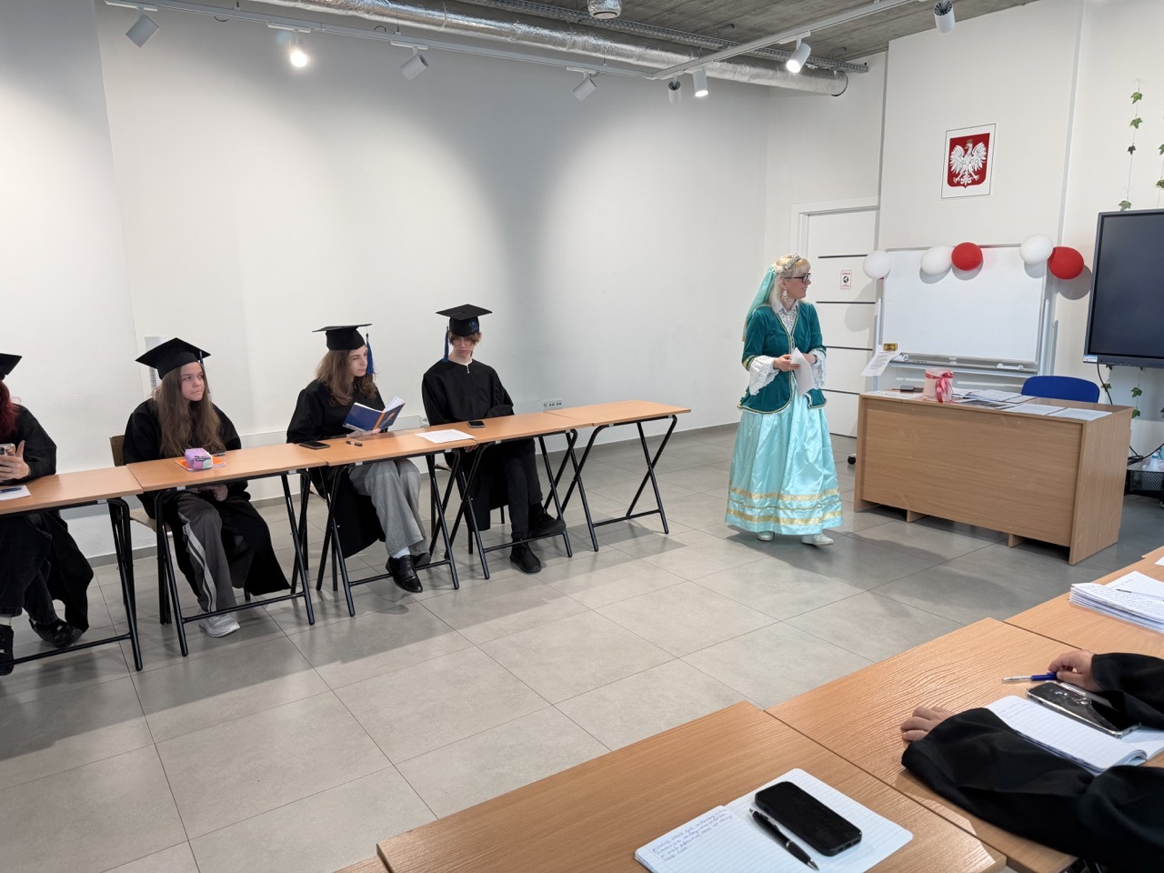 To nie była zwykła lekcja. Uczniowie, ubrani w czarne togi i birety, zasiedli przy stołach ustawionych w podkowę, przypominając zgromadzenie dostojników lub sędziów historii. Atmosferę dopełniła obecność gościa specjalnego – postaci w błękitno-złotej sukni z epoki, która niczym postać wyjęta prosto z jagiellońskiego dworu, przeprowadziła nas przez zawiłe losy Rzeczypospolitej.