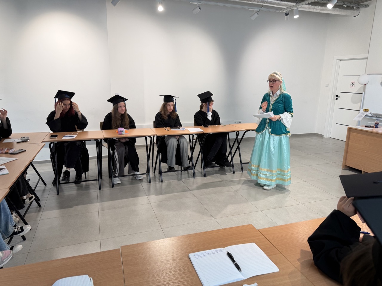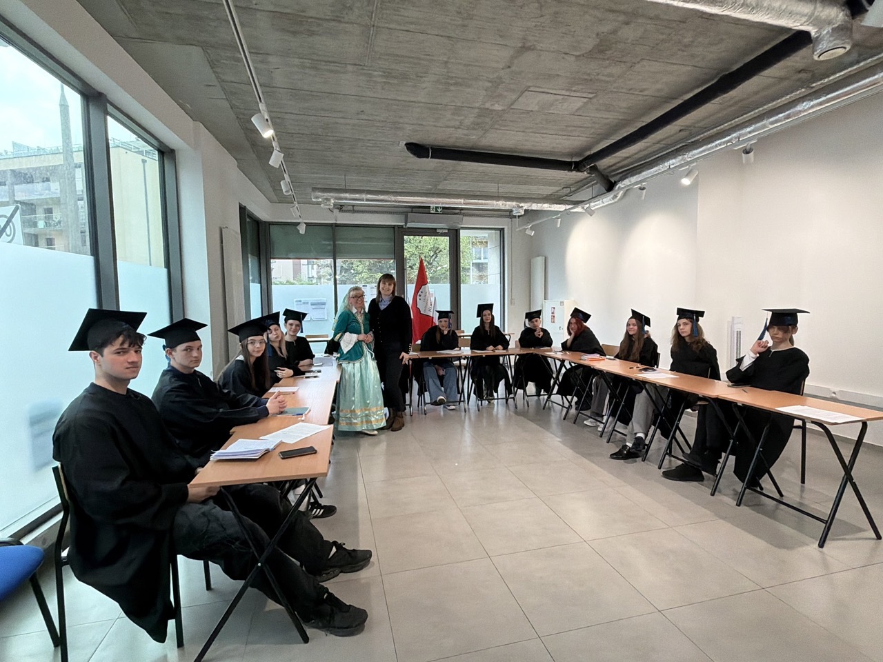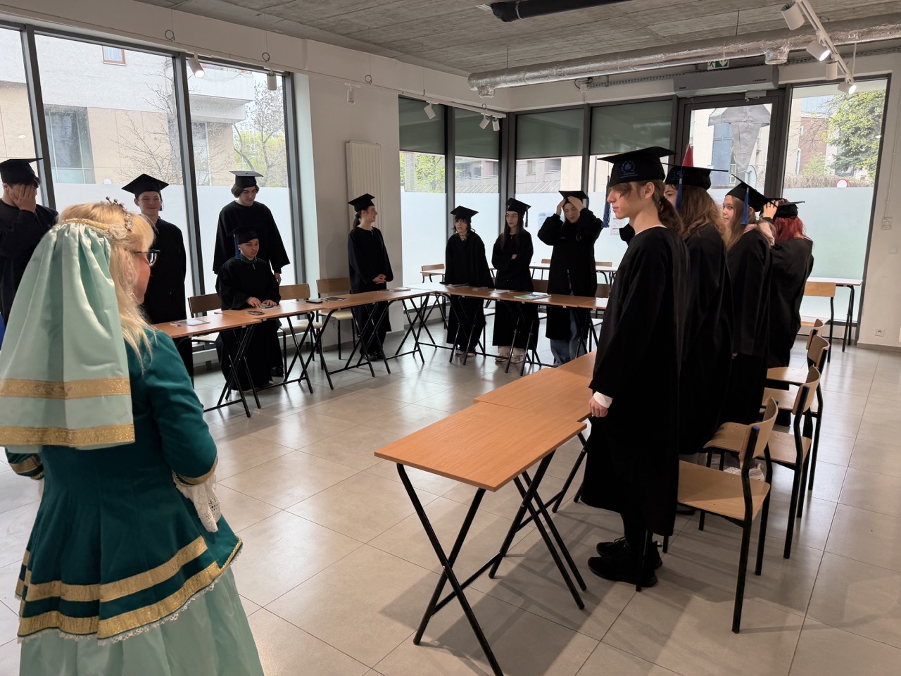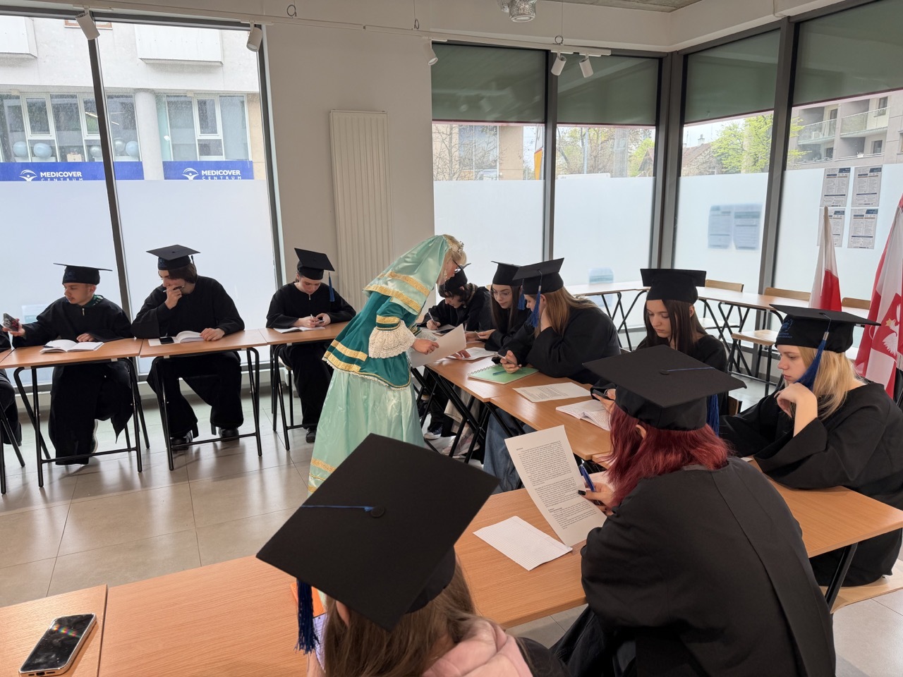 To nie była zwykła lekcja. Uczniowie, ubrani w czarne togi i birety, zasiedli przy stołach ustawionych w podkowę, przypominając zgromadzenie dostojników lub sędziów historii. Atmosferę dopełniła obecność gościa specjalnego – postaci w błękitno-złotej sukni z epoki, która niczym postać wyjęta prosto z jagiellońskiego dworu, przeprowadziła nas przez zawiłe losy Rzeczypospolitej.