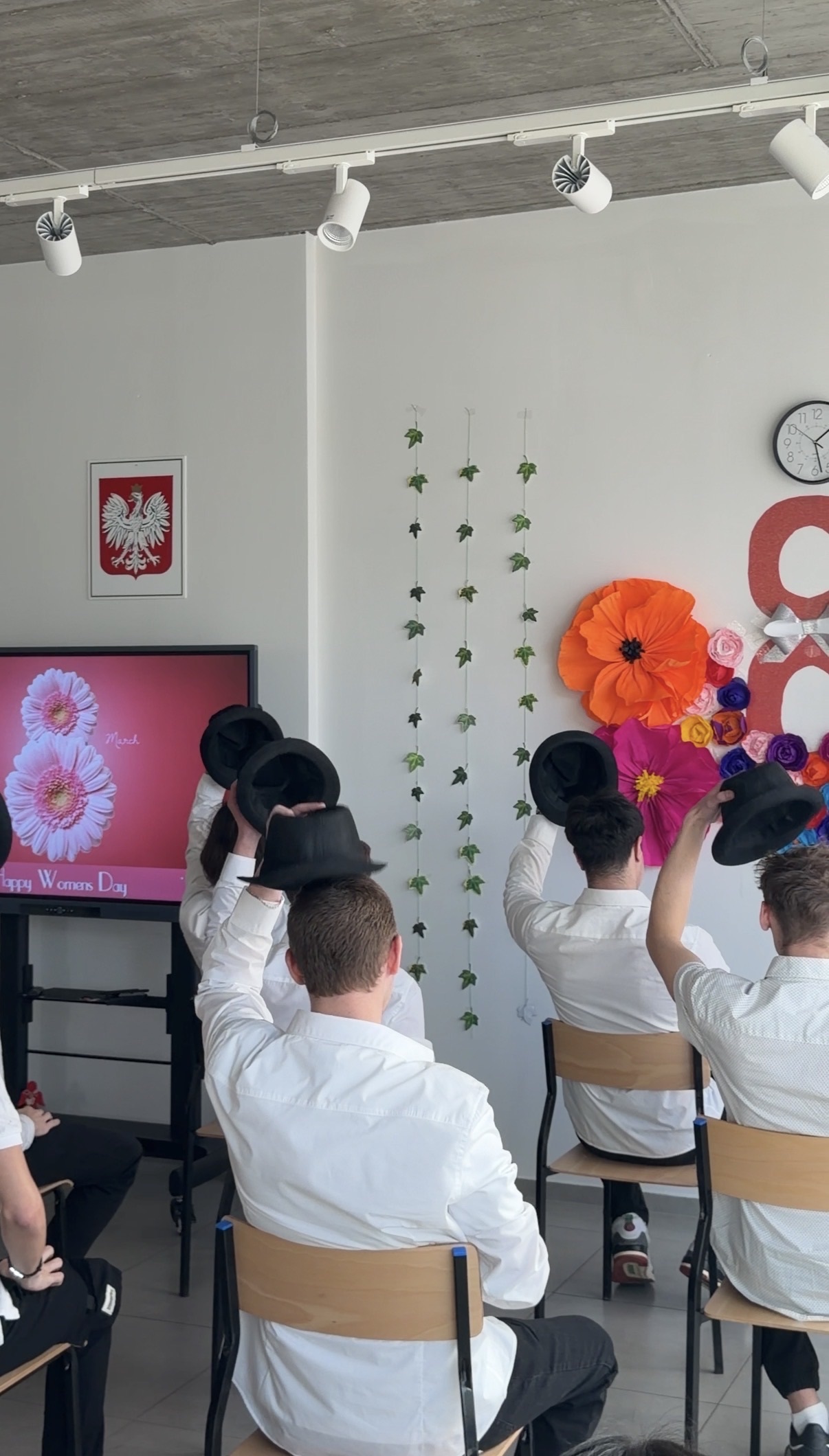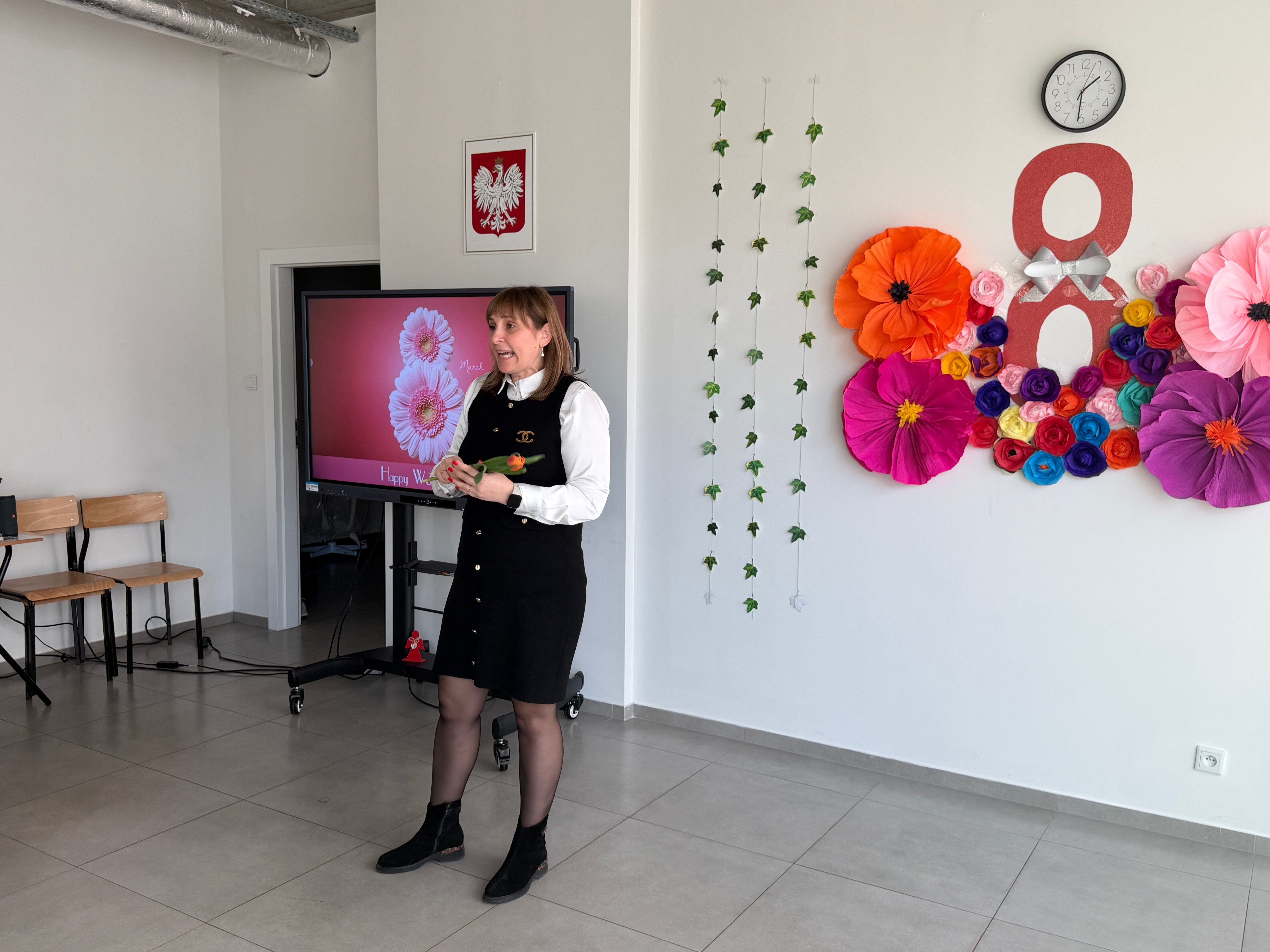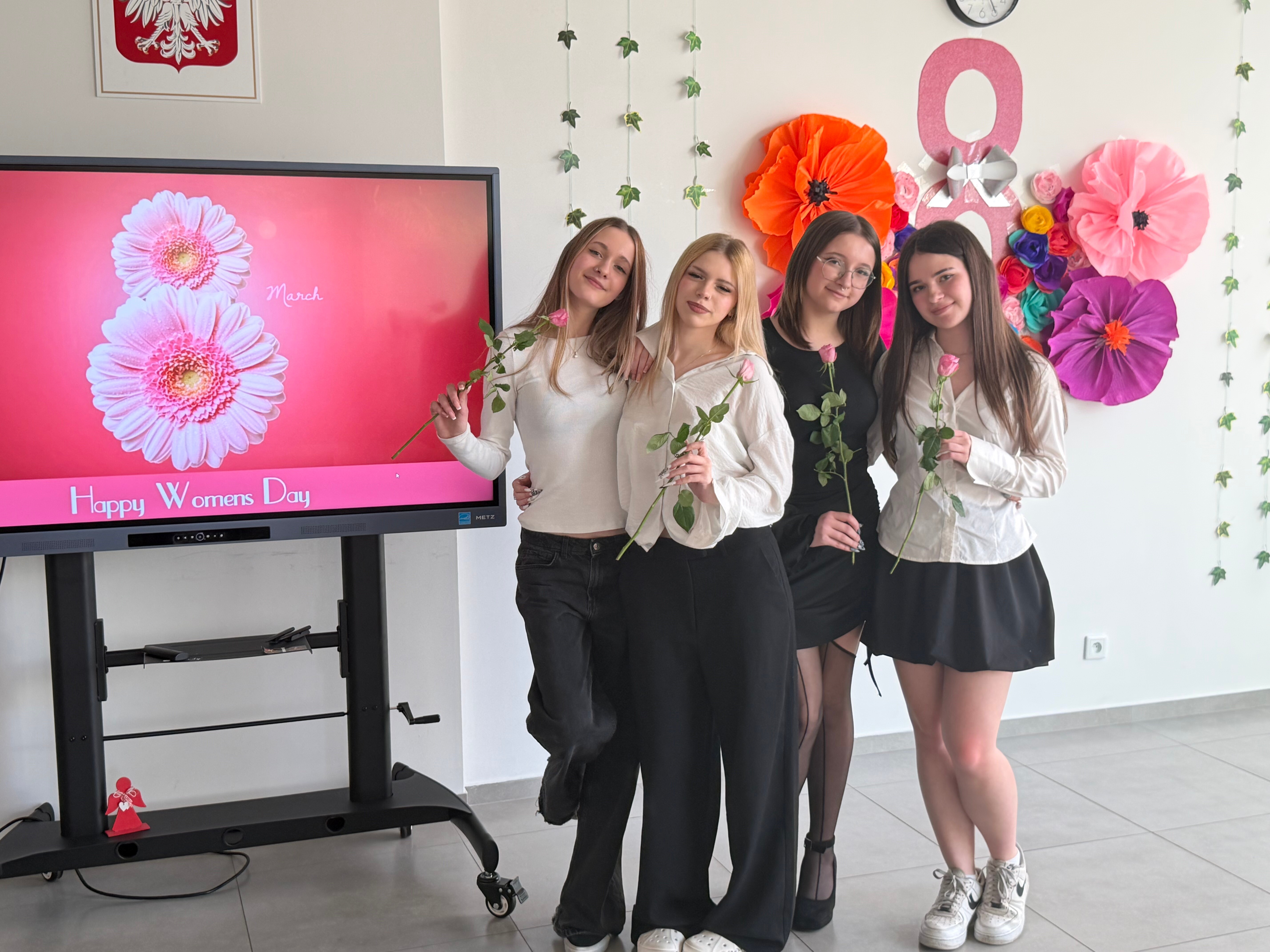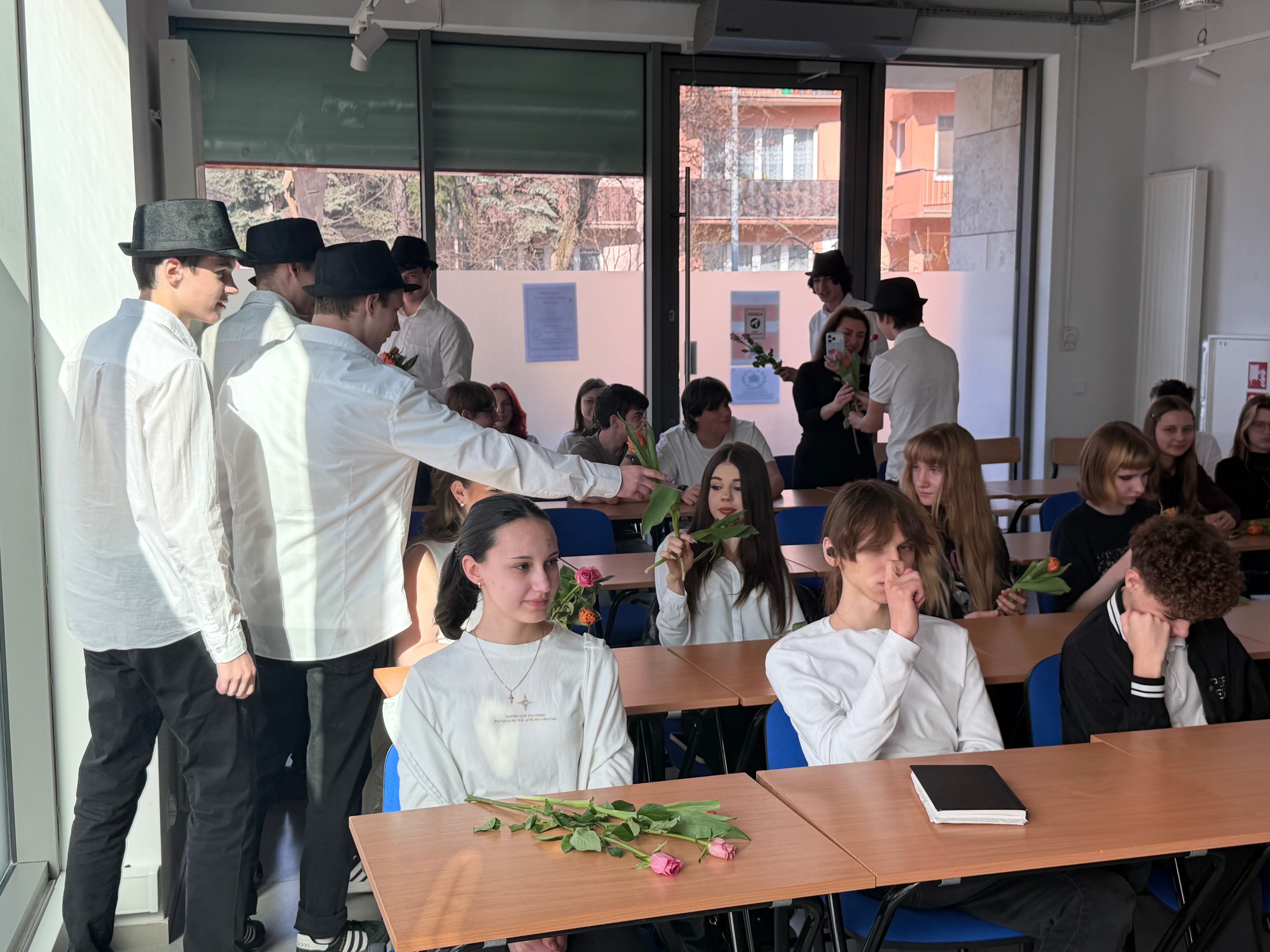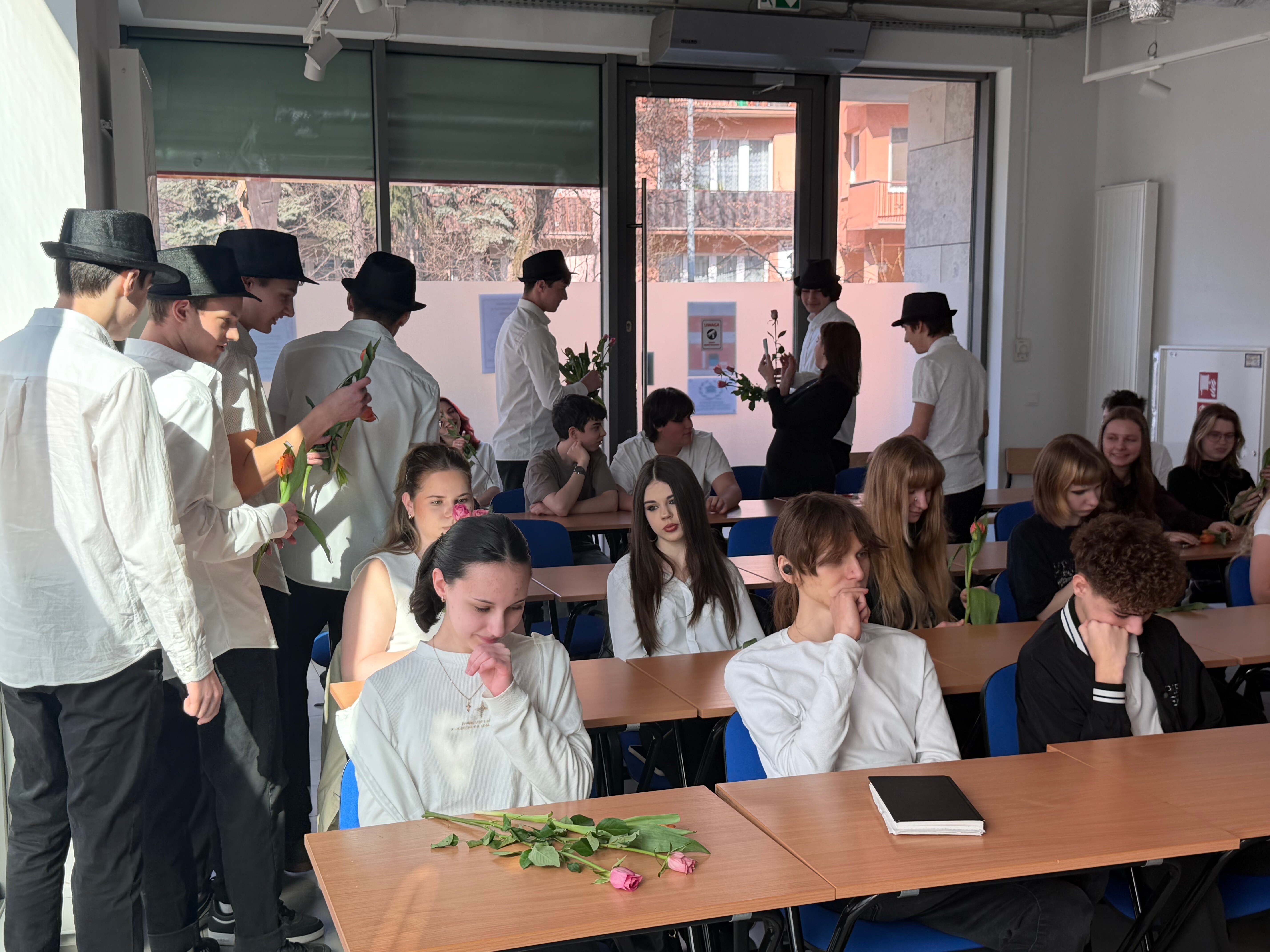Ukoronowaniem tego pięknego dnia był tradycyjny, ale jakże miły gest ze strony męskiej części szkoły – chłopcy z wielką elegancją wręczyli wszystkim koleżankom oraz nauczycielkom piękne kwiaty, dbając o to, by każda kobieta tego dnia poczuła się wyjątkowo doceniona.